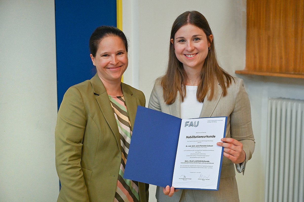 Nach Eröffnung ihres Habilitationsverfahrens im Oktober 2022 konnte Frau Dr. med. dent. habil. Julia Lubauer ihre Habilitation nun erfolgreich abschließen. Das Vorsprechen vor dem Fakultätsrat absolvierte sie bereits am Donnerstag, den 13. Juni 2024, und hielt dort ihren Kolloquiumsvortrag mit dem Titel „Von amorph zu kristallin - Glaskeramik als dentales Restaurationsmaterial“.